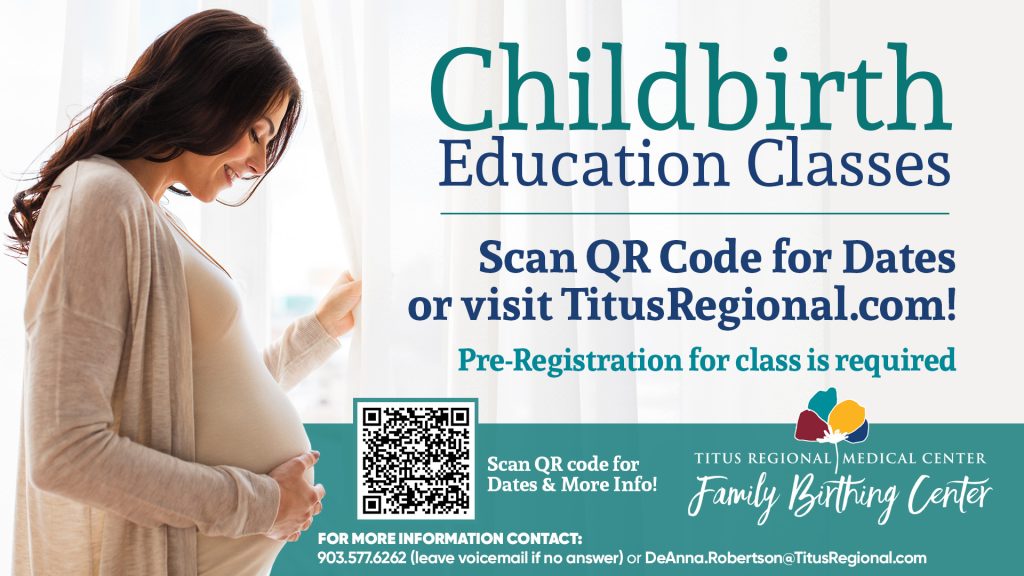 Join us for a free, exciting, and informative in-person childbirth education class at Titus Regional Medical Center in Mount Pleasant, TX. Our instructors will guide you through all the essential information you need to know about childbirth. From prenatal care, to labor & delivery, to the the care of your newborn, we’ll cover it all! This class is designed to empower expectant parents with knowledge and skills to make informed decisions about their birthing experience. Don’t miss this opportunity to connect with other parents-to-be and prepare for the arrival of your little one. Sign up now and bring your support person.