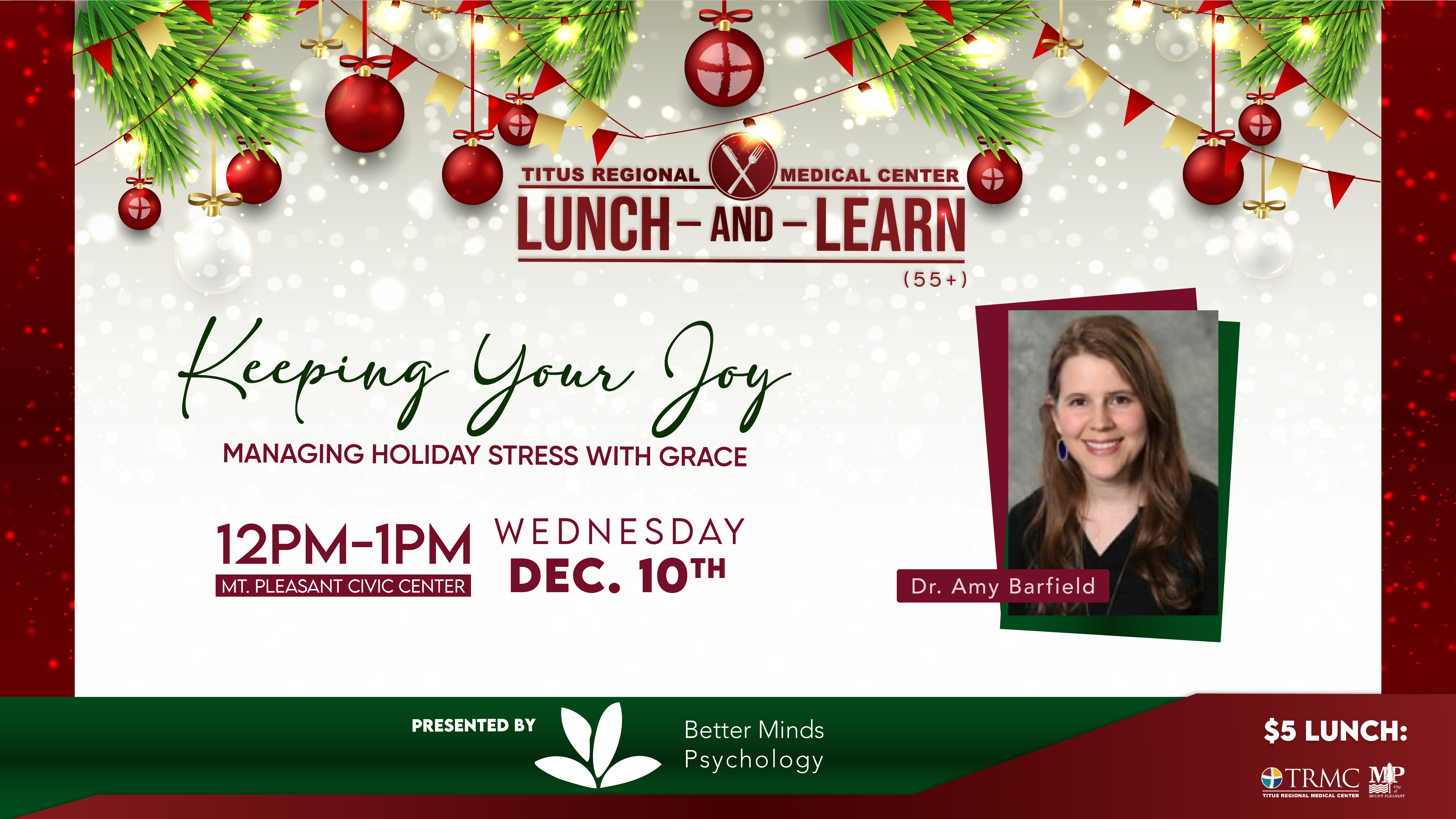 For our 55+ community members, join us as we gather for Lunch & Learn on Wednesday, December 10th, from 12-1 PM at the Mt. Pleasant Civic Center. This month, we'll be hearing from Dr. Amy Barfield from Better Minds Psychology as she presents "Keeping Your Joy - Managing Stress During the Holidays with Grace". Bring $5 to enjoy a tasty ...