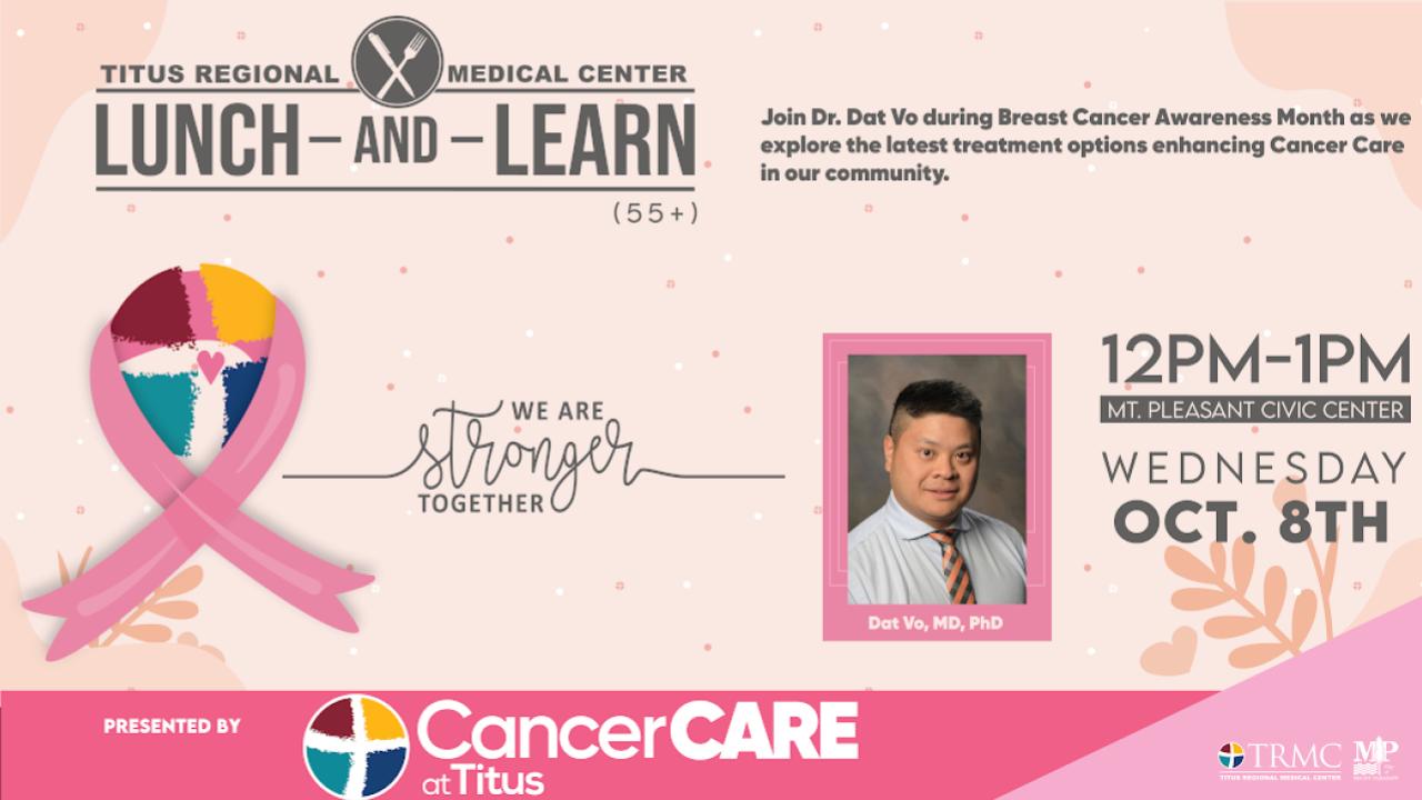 For our 55+ community members, join us as we gather for Lunch & Learn on Wednesday, October 11, from 12-1 PM at the Mt. Pleasant Civic Center. This month we will be hearing from the Cancer Care at Titus Team as we discuss the big "C"... Bring $5 to enjoy a tasty lunch of chicken spaghetti, black-eyed peas, cornbread, salad, ...